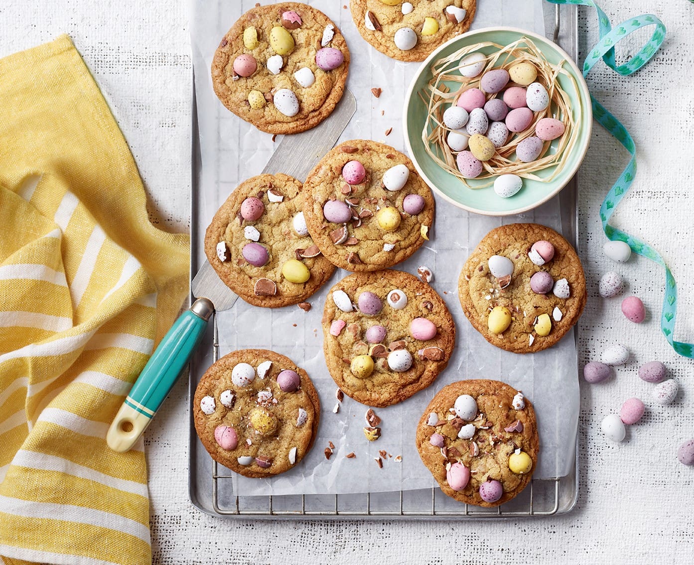 Remove the cookies from the oven and press 3 or 4 mini eggs into each cookie, then sprinkle with some of the roughly chopped mini eggs.