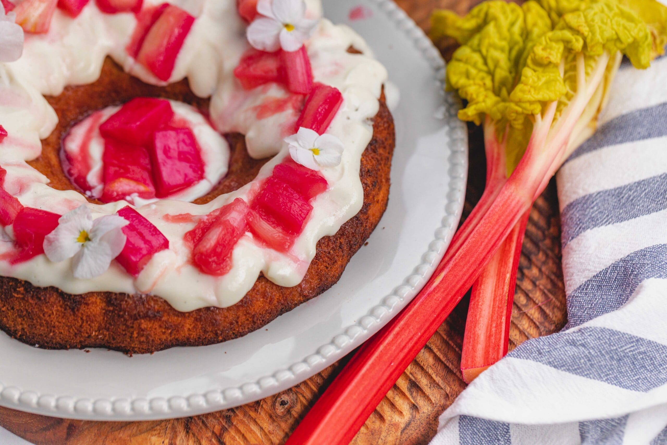 Sieve one pot of icing sugar into a bowl and stir through the Natural Yoghurt and vanilla paste. Spoon the frosting onto the cake and carefully arrange the remaining rhubarb on top. Finish with edible flowers if you wish.
